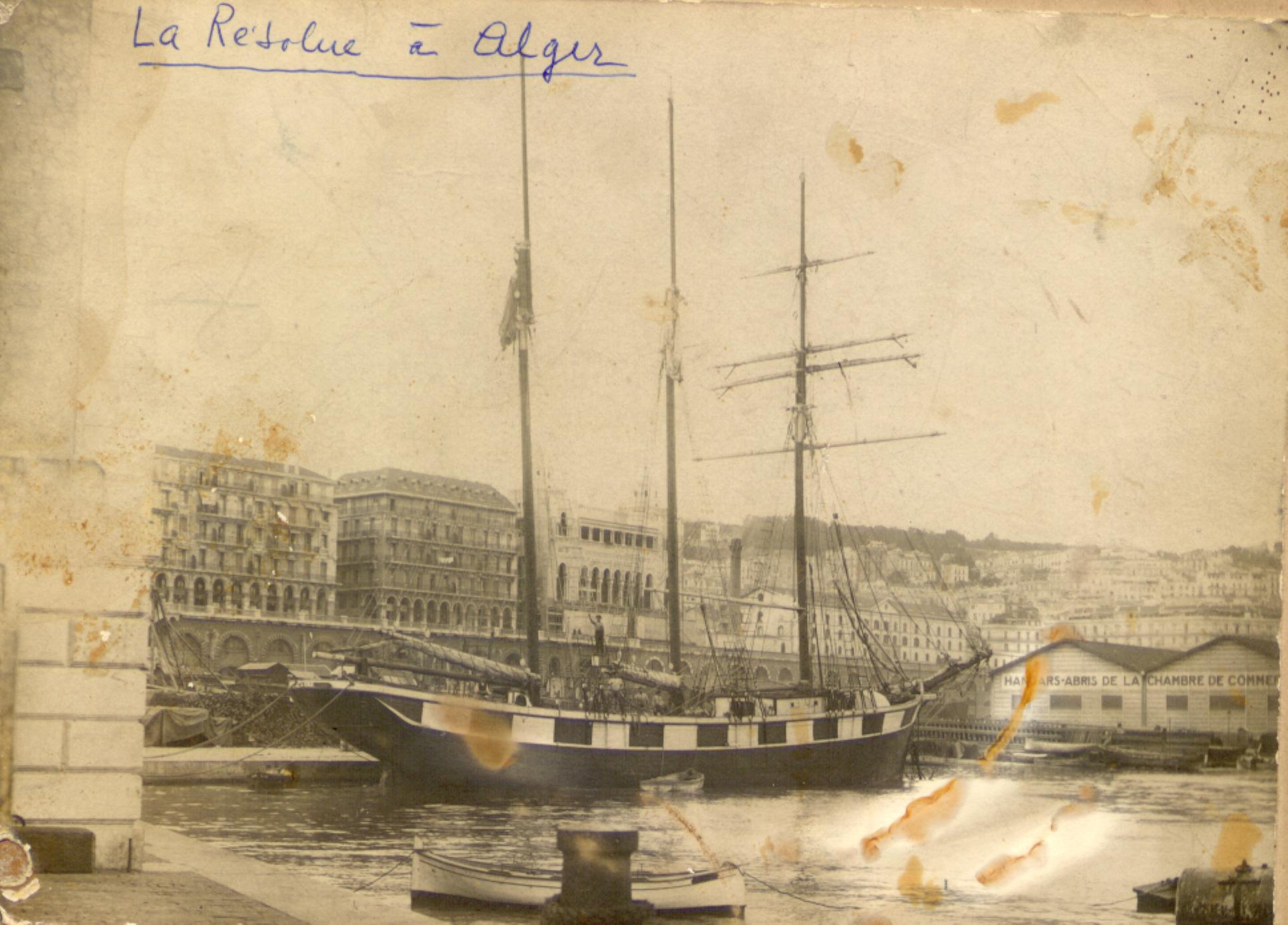 C'est donc le 8 novembre 1911, qu'inscrit maritime provisoire au quartier d'Alger, je fis mes débuts dans la navigation en embarquant comme pilotin sur le 3 Mâts Goélette "La Résolue", petit voilier école destiné à former de futurs Officiers de la Marine Marchande. Le Commandant était l'ancien directeur de lEcole Libre d'Hydrographie d'Alger. Il espérait avoir douze élèves pour lesquels les installations étaient prévues. Mais finalement nous ne fûmes que deux. Il est vrai que le coût de la pension était assez élevé pour l'époque : 120 francs par mois.