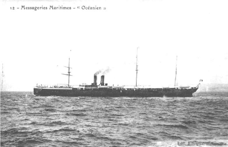 Après deux voyages sur le Tibet, me sentant le pied marin bien consolidé, avide de voir d'autres pays et désireux aussi de soulager mes parents en leur évitant ces dépenses, j'embarquais en qualité de novice sur le paquebot OCEANIEN des Messageries Maritimes qui partait pour l'Australie et la Nouvelle Calédonie (via Suez). Là ; c'était une autre aventure qui commençait ! Non seulement mes parents n'avaient plus rien à payer, mais c'était moi qui percevais une solde : 45 francs par mois ! Le premier argent que j'ai gagné ! Mais on était sous le régime de la loi de douze heures pour les adultes et dix heures pour les moins de 18 ans ! Aussi me fallait-il être debout tous les matins à 4 heures et la journée ne finissait qu'à 17 heures après un arrêt de 8 à 9 heures et un autre de 11 heures à 13 heures. Ce n'était plus le carré des officiers, mais le menu des matelots et en guise de cabine je possédais qu'un hamac qu'il fallait décrocher le matin après le réveil et qu'on ne pouvait remettre en place que le soir à partir de 20 heures ! Mais j'y dormais fort bien et ne regrettais en rien cette nouvelle existence qui m'a fait connaître la vie en commun.
