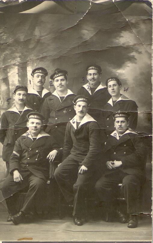 A mon ordre d'appel je rallie Toulon et je suis versé au 5ème Dépôt des Equipages en qualité de matelot de 3ème classe, premier grade dans la Marine Nationale donné d'office aux inscrits maritimes, les autres recrutés ou engagés commençant par être apprentis marins. Ma solde était assez bizarre, un mois : 5 francs, un autre 10 francs et ainsi de suite. Je dois dire que depuis le début des hostilités les Ecoles d'Hydrographie avaient été fermées et aucun examen pour la Marine Marchande n'avait plus lieu. De plus le cours des élèves officiers de réserve vers lequel j'aurais été dirigé en temps normal, du fait que j'étais Elève de la Marine Marchande avait également été suspendu car le navire sur lequel il avait habituellement lieu avait été incorporé dans l'Armée Navale. Nous étions d'ailleurs nombreux dans ce cas, mais que pouvions nous faire contre ces décisions ?